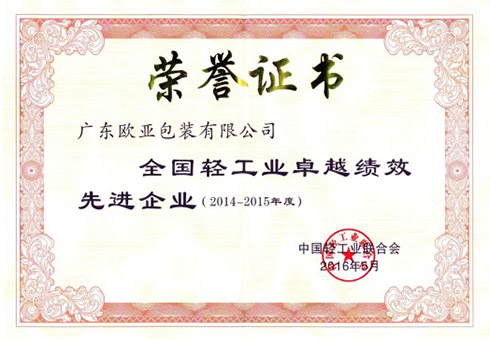炎炎夏日,公司各部门工作如火如荼地开展。 在7月22日刚结束的“2016年全国轻工业优秀质量管理小组、质量信得过班组成果发布暨交流会”上,广东欧亚包装有限公司喜获三项奖励: 一、全国轻工业卓越绩效先进企业(2014-2015年度) 二、全国轻工业质量管理小组活动优秀企业。 三、广东欧亚包装有限公司总经理连运增先生,获得全国轻工业质量管理小组活动卓越领导者称号。